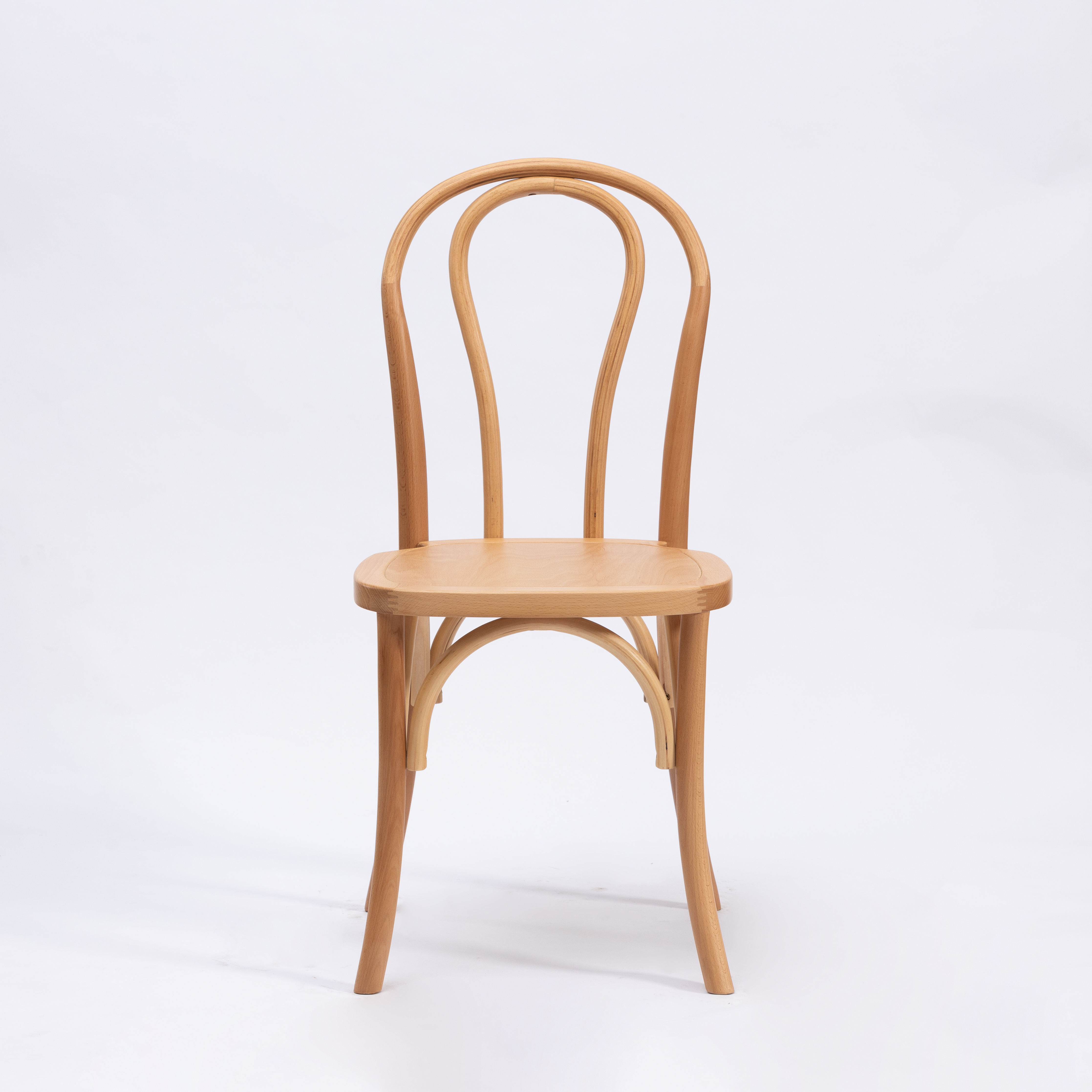Frame: Light-toned solid wood, birch or beech, steam-bent to create smooth curves, with a natural finish highlighting the wood grain.