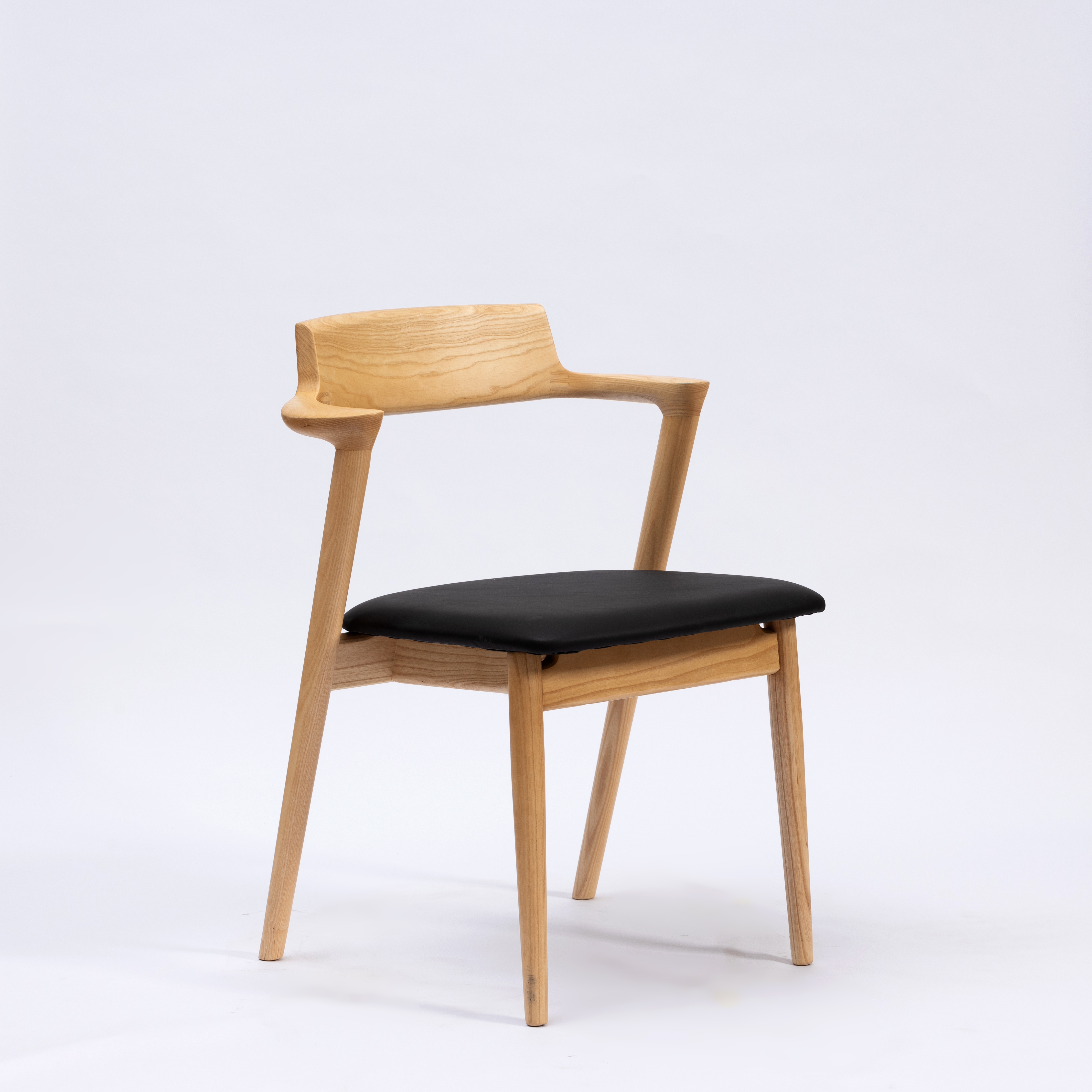 Its elegant, timeless Scandinavian aesthetic complements minimalist and contemporary interiors. The ergonomically curved wooden frame provides excellent support for the back and arms. The natural wood offers durability and a warm, inviting feel. The upholstered seat ensures comfort during extended use. Its versatile design is suitable for various settings, from dining rooms to living spaces.